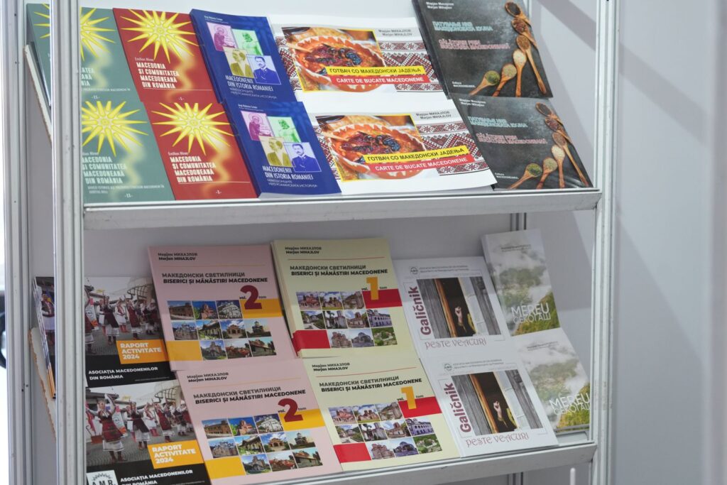 La standul AMR veți putea descoperi o colecție impresionantă de volume publicate de Asociația Macedonenilor din România, semnate chiar de membrii comunității noastre, lucrări care reflectă identitatea, tradițiile și patrimoniul cultural macedonean.